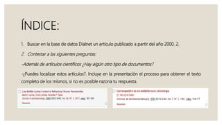 Este documento proporciona instrucciones para buscar artículos en la base de datos Dialnet Plus. Instruye al lector sobre cómo buscar un artículo publicado después del año 2000 sobre el uso de antibióticos y antiinflamatorios en la gingivitis y la periodontitis. Explica el proceso de búsqueda, incluyendo los tipos de documentos disponibles en Dialnet como artículos de revista, tesis y más. También describe cómo localizar artículos completos a través del catálogo de la Universidad de Sevilla cuando solo están dispon