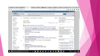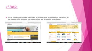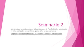 El documento describe los pasos para realizar una búsqueda en la base de datos PubMed sobre artículos de revisión en español publicados en los últimos 15 años sobre la prevención de la obesidad y el sobrepeso en niños y adolescentes. Primero, traduce las palabras clave al inglés usando el tesauro DeCS. Luego, realiza una búsqueda en PubMed usando operadores booleanos para combinar términos. Finalmente, explica cómo acceder a artículos gratis o pedirlos a través de la biblioteca si son de pago.