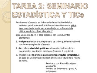 El documento describe los pasos que una estudiante de enfermería tomó para buscar artículos en la base de datos PubMed sobre cómo los blogs y wikis contribuyen a la enseñanza y el aprendizaje en enfermería. La estudiante realizó una búsqueda en PubMed de artículos publicados en los últimos cinco años utilizando palabras clave. Seleccionó cinco artículos relevantes y generó referencias bibliográficas en formato uniforme. También incluyó capturas de pantalla de su búsqueda en PubMed y las primer