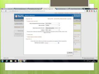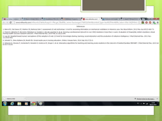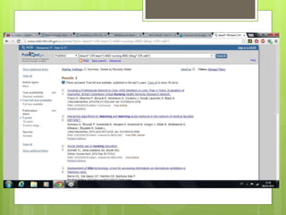 El documento describe cómo la autora aprendió a usar la base de datos PubMed en inglés para realizar una búsqueda sobre cómo los blogs y wikis contribuyen a la enseñanza y el aprendizaje en enfermería. Explica los pasos de la estrategia de búsqueda utilizada, la selección de 5 artículos relevantes y su importación y almacenamiento en RefWorks para su posterior uso en la bibliografía.