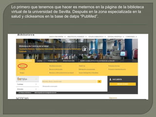 El documento describe los pasos para realizar una búsqueda en la base de datos PubMed sobre cuidados paliativos y enfermedades pulmonares obstructivas crónicas. Primero, se accede a la biblioteca virtual de la Universidad de Sevilla y a PubMed. Luego, se usa la base de datos DECS para traducir términos al inglés como "cuidados paliativos". Finalmente, se realiza la búsqueda en PubMed y se seleccionan cinco artículos relevantes para guardar en Mendeley.