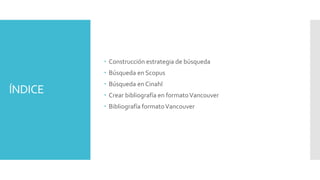 Este documento presenta la búsqueda de información realizada por Paula Medina Martínez sobre cómo influye la intervención de enfermería en la calidad de vida de las personas con esclerosis lateral o esclerosis múltiple. Describe la construcción de la estrategia de búsqueda utilizando términos clave y tesauros, y la búsqueda de artículos relevantes en las bases de datos Scopus y CINAHL. También explica cómo crear las citas y bibliografía de los artículos encontrados en formato Vancouver utilizando el software Mendeley.