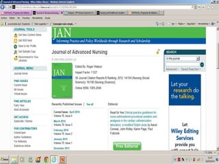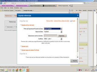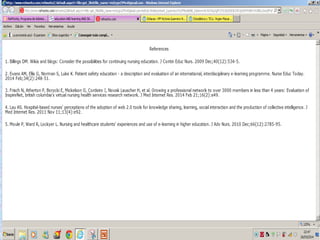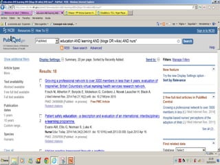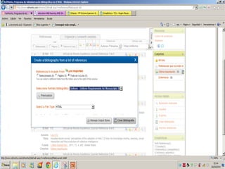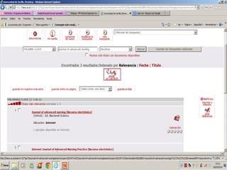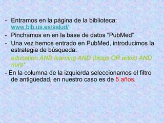 El documento describe los pasos para realizar una búsqueda bibliográfica sobre educación, aprendizaje, blogs y wikis en enfermería en la base de datos PubMed y guardar los resultados en RefWorks. Incluye buscar artículos completos a través de la base de datos o el catálogo Fama de la biblioteca y filtrar los resultados por antigüedad.