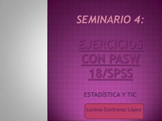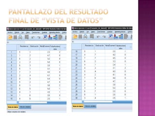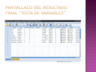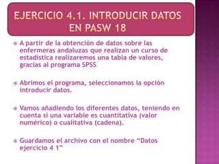 El documento describe los pasos para crear una tabla de valores de datos sobre enfermeras andaluzas usando el programa SPSS: 1) abrir SPSS y seleccionar la opción para introducir datos, 2) añadir los diferentes datos teniendo en cuenta si son cuantitativos o cualitativos, y 3) guardar el archivo con un nombre. Luego, se muestra una captura de pantalla del resultado final en Excel.