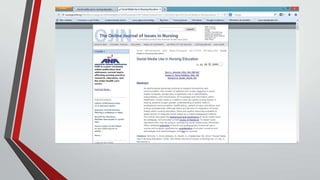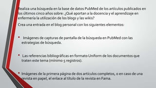El documento proporciona instrucciones para realizar una búsqueda en la base de datos PubMed sobre cómo los blogs y wikis contribuyen a la docencia y el aprendizaje en enfermería. Se pide incluir capturas de pantalla de la búsqueda en PubMed con las estrategias de búsqueda utilizadas, así como las referencias bibliográficas en formato Uniform de al menos 5 documentos relevantes y las primeras páginas o enlaces a dos artículos completos. Adicionalmente, se explican los pasos para realizar la bibliografía