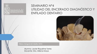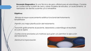 El encerado diagnóstico y el enfilado dentario son técnicas útiles para la planificación del tratamiento prostodóncico. El encerado diagnóstico consiste en confeccionar una réplica de cera sobre modelos de estudio para simular el reemplazo de dientes ausentes. Esto permite una mejor planificación del tratamiento y transmitir el resultado esperado al paciente y odontólogo. El enfilado dentario involucra colocar dientes artificiales sobre cera para simular la estética y función de la prótesis definitiva considerando par