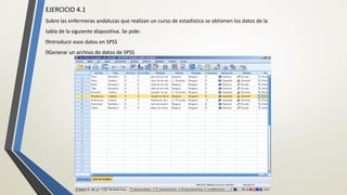 Este documento presenta 5 ejercicios sobre el uso de SPSS y Excel para analizar datos estadísticos. Los ejercicios incluyen introducir datos en SPSS y exportarlos a Excel, importar datos de Excel a SPSS, abrir y definir variables en una base de datos SPSS existente, y crear un nuevo archivo de datos en SPSS a partir de un cuestionario.