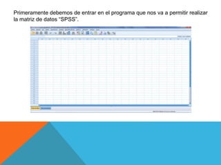 Este documento proporciona instrucciones para crear una matriz de datos en el programa SPSS. Explica cómo definir variables en la vista de variables, incluyendo el nombre, tipo, anchura, decimales, etiqueta, valores, perdidos, alineación y medida de cada variable. También describe cómo insertar los datos individuales en la vista de datos para completar la matriz.