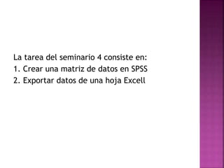 Este documento resume los pasos para crear una matriz de datos en SPSS y exportar datos de una hoja de Excel. Primero, se añaden las variables en la columna "Nombre" y se cambian los formatos. Luego, se introducen los valores de las variables en la vista de variables. Finalmente, se abre un archivo de Excel y se selecciona para exportar los datos a una nueva hoja en SPSS.