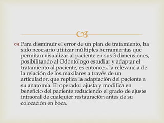 Este documento describe el uso de herramientas como articuladores para visualizar al paciente en 3D y estudiar el tratamiento odontológico. La posición inicial de diagnóstico se realizó en máxima intercuspidación debido a la estabilidad oclusal del paciente. Parámetros como la coincidencia de líneas medias y contactos oclusales se usaron para criticar el montaje. Se concluyó que la estabilidad oclusal, articular y neuromuscular es esencial para la rehabilitación y cada caso es único.