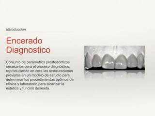 Este documento describe las técnicas de encerado diagnóstico y enfilado dentario. Explica que el encerado diagnóstico muestra el resultado final preliminar y permite analizar el espacio requerido y motivar al paciente. Detalla los pasos para realizar el encerado en prótesis fija y reconstrucciones totales, así como el proceso de enfilado dentario en prótesis removibles.