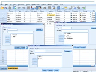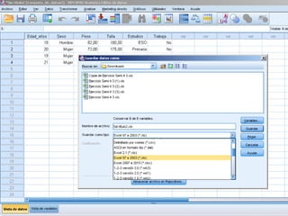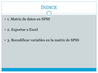 Este documento describe cómo crear y editar una matriz de datos en SPSS. Explica que una matriz de datos organiza la información de investigación en una estructura cuadrangular para sistematizar los datos y facilitar su análisis. Luego detalla los pasos para introducir datos en una hoja en blanco en SPSS, realizar cambios necesarios en etiquetas y valores, añadir más datos, y exportar la matriz completa a una hoja de Excel para su uso en otras aplicaciones.