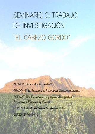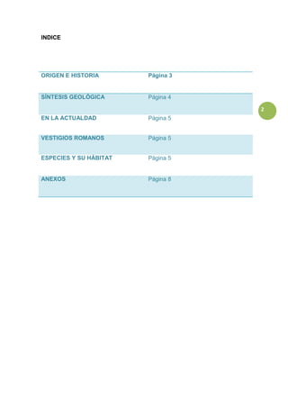 Este documento resume la historia y características geológicas y biológicas del Cabezo Gordo, un monte calizo situado en Torre Pacheco, Murcia. Explica que el Cabezo data del Triásico y contiene fósiles de homínidos neandertales. También describe los diferentes hábitats del monte como el roquedo y sus especies asociadas. Finalmente, menciona los vestigios romanos encontrados en la zona y la importancia de preservar la historia local.