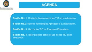 El documento presenta un seminario sobre educación y nuevas tecnologías. La agenda incluye sesiones sobre el contexto básico de las TIC en educación, nuevas tecnologías aplicadas a la educación y el uso de las TIC en procesos educativos, culminando con un taller práctico sobre su uso. Define las TIC y explica su clasificación y aportes, centrándose en su aplicación en la educación.