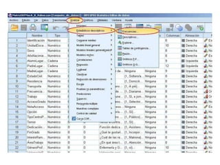 El documento describe tres ejercicios para analizar datos demográficos utilizando tablas de contingencia, frecuencias y gráficos en IBM SPSS Statistics. El primer ejercicio implica crear tablas de contingencia para examinar las relaciones entre variables nominales. El segundo ejercicio implica crear tablas de frecuencias para variables nominales y de escala. El tercer ejercicio implica representar gráficamente variables nominales y de escala usando diagramas como sectores, barras, histogramas y cajas.