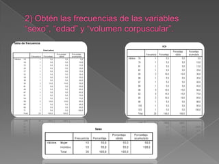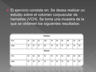 El documento describe los pasos para realizar un estudio sobre el volumen corpuscular de hematíes (VCH) en una muestra. Incluye generar estadísticas descriptivas, gráficos como diagramas de cajas e histrogramas para variables como edad y VCH, y tablas de contingencia relacionando edad y sexo.