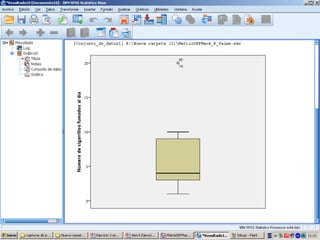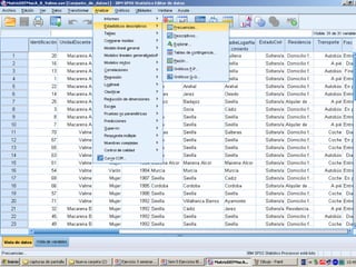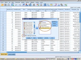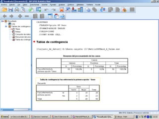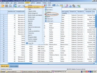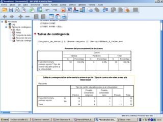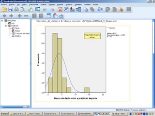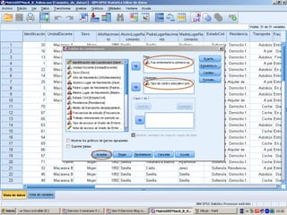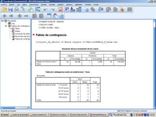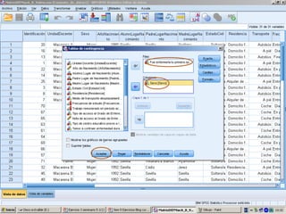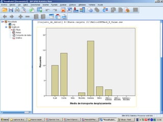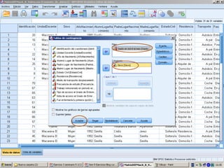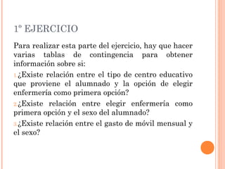 Este documento describe tres ejercicios para analizar datos usando el programa SPSS. El primer ejercicio implica crear tablas de contingencia para examinar las relaciones entre la opción educativa, sexo y gastos de móvil. El segundo ejercicio implica crear tablas de frecuencia sobre sexo, edad, estatura, trabajo y estudios. El tercer ejercicio implica representar gráficamente variables nominales y de escala usando diagramas de sectores, barras, histogramas y cajas.