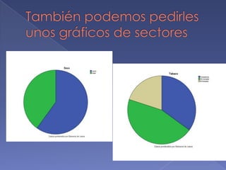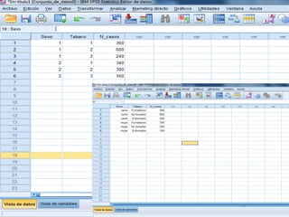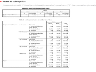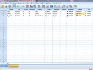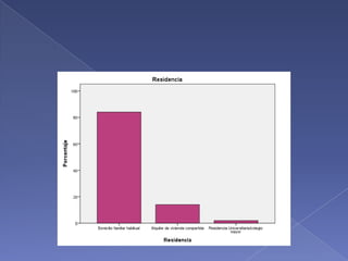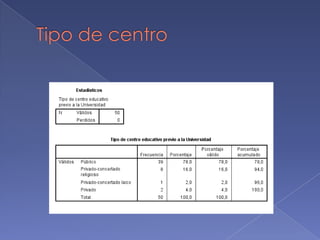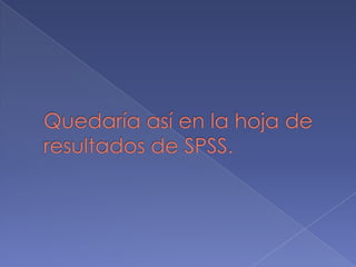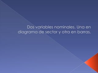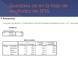 El documento describe cómo realizar tablas de contingencia y frecuencias utilizando el SPSS para analizar la relación entre variables. Se mencionan tres preguntas de investigación y sus resultados. También explica cómo representar datos nominales y de escala gráficamente en el SPSS.