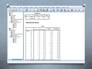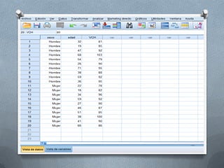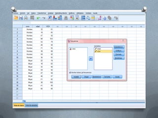 El documento describe los ejercicios que se realizarán en el seminario 5 utilizando el programa PASW 18. Los ejercicios incluyen calcular estadísticas descriptivas para las variables "edad" y "VCH", obtener frecuencias de variables, crear gráficos de distribución, crear un gráfico que relacione "edad" y "sexo", y crear una tabla de contingencia que relacione "edad" y "sexo". Se explicará el procedimiento para cada ejercicio mediante capturas de pantalla.