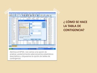 El documento describe tres tablas de contingencia que se realizarán para analizar: 1) la relación entre el tipo de centro educativo del que proviene el alumnado y su elección de Enfermería como primera opción, 2) la relación entre la elección de Enfermería como primera opción y el sexo del alumnado, y 3) la relación entre el gasto mensual en el móvil y el sexo. Se explica brevemente cómo se crean tablas de contingencia en SPSS.