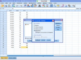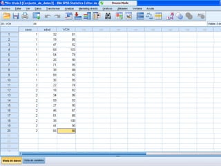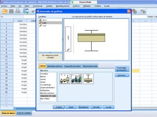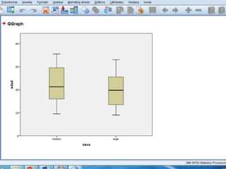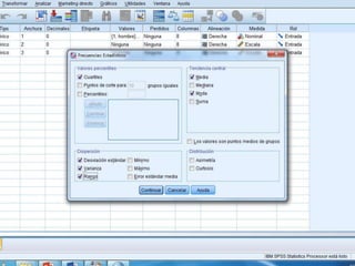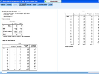Este documento presenta los resultados de dos estudios estadísticos. El primer estudio analiza los resultados académicos de 50 estudiantes, encontrando que la nota más común fue un 4, la media fue de 4.98 y la mediana fue de 5. El segundo estudio examina las edades de 150 jóvenes, encontrando una media de 21.67 años, una mediana y moda de 18-22 años, y un rango de 15. El documento también incluye fórmulas para calcular la desviación típica.