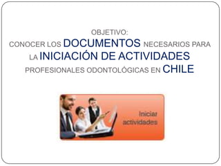 Este documento resume los requisitos para iniciar actividades profesionales odontológicas en Chile ante el Servicio de Impuestos Internos (SII). Explica que los odontólogos deben iniciar actividades en el SII y presentar una copia legalizada de su título profesional dentro de los 2 meses. Detalla los pasos para realizar el trámite ya sea por internet o directamente en una oficina del SII.