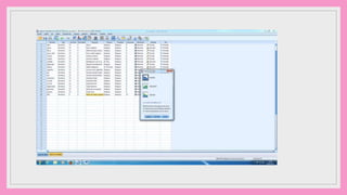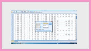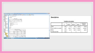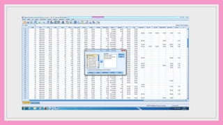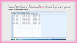 El documento describe los pasos realizados en un seminario sobre obesidad. Primero, se cambiaron las medidas nominales a escala y se creó una tabla de frecuencias con variables como edad, peso y altura. Luego se generaron histogramas y se seleccionaron los de edad y altura para presentar. Finalmente, se calcularon descriptivos, percentiles y tablas de cajas para analizar la distribución de las variables entre sexos.
