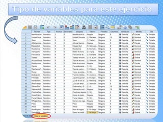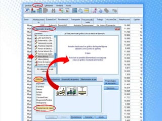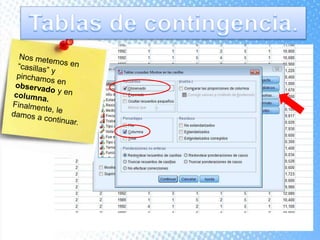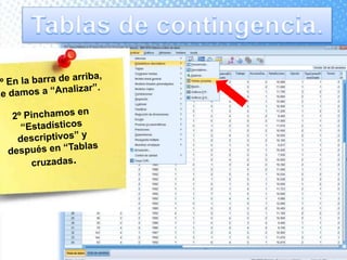 Este documento explica cómo realizar tablas de contingencia y representaciones gráficas para analizar la relación entre variables. Se crean tablas cruzadas y se usa la prueba chi-cuadrado para determinar si existe una relación entre dos variables, como el tipo de centro educativo y la elección de enfermería. Los gráficos incluyen diagramas de sectores, barras, histograma con curva normal y diagrama de cajas para visualizar variables nominales, ordinales y de escala.