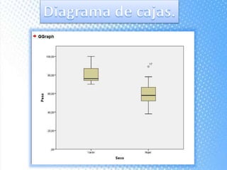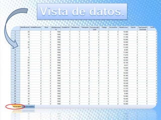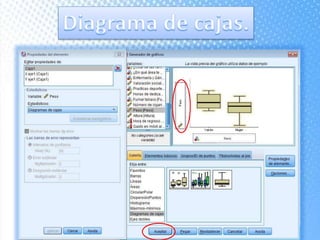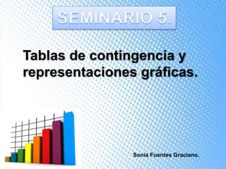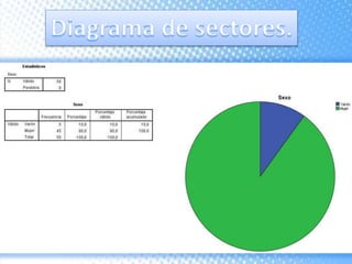 Este documento explica cómo realizar tablas de contingencia y representaciones gráficas para analizar la relación entre variables. Se crean tablas cruzadas y se usa la prueba chi-cuadrado para determinar si existe una relación entre variables como el centro educativo previo y la elección de Enfermería, o el gasto mensual en el móvil y el sexo. También se muestran diferentes tipos de gráficos como diagramas de sectores, barras e histograma para representar variables nominales y de escala.