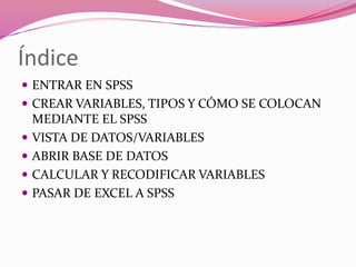 Este documento proporciona instrucciones para usar el programa SPSS: explica cómo crear variables y tipos de datos, abrir una base de datos, calcular y recodificar variables, y pasar datos de Excel a SPSS. Proporciona capturas de pantalla para ilustrar cada paso, como añadir variables cuantitativas y cualitativas, modificar sus características, y ver los datos y variables de diferentes formas. También explica cómo calcular nuevas variables, recodificar variables cuantitativas a cualitativas, y cargar datos de Excel a SPSS.