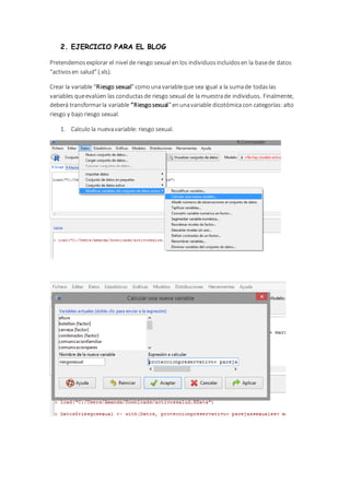 El documento propone dos ejercicios. El primero consiste en recodificar la variable IMC para que recoja las categorías clínicas estándar. El segundo ejercicio pretende explorar el nivel de riesgo sexual en una base de datos, creando una variable que sume las conductas de riesgo y luego recodificándola en una variable dicotómica de alto y bajo riesgo.