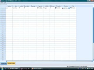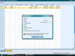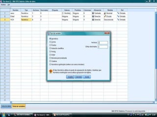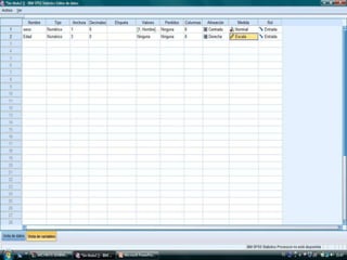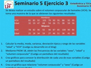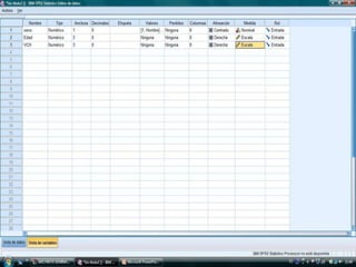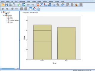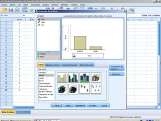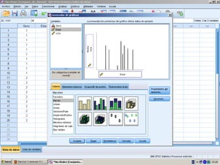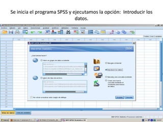 El documento describe los pasos para introducir y analizar datos en SPSS: 1) introducir las variables Sexo, Edad y VCH, 2) introducir los datos de cada individuo, 3) calcular estadísticas como la media y desviación estándar ejecutando la opción "Analizar, Frecuencias, Estadísticos", 4) obtener tablas de frecuencia y 5) crear gráficos para observar las variables y su relación.