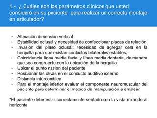 El documento presenta un resumen de un seminario sobre exámenes complementarios y análisis instrumental de la oclusión de un paciente. Se describen los parámetros clínicos considerados para el montaje en articulador, las consideraciones con los modelos, la posición inicial de diagnóstico utilizada y cómo se obtuvo. También se analizan los parámetros clínicos de los modelos por separado y cómo evaluar y medir las discrepancias entre la posición de relación céntrica y la máxima intercuspidación. Finalmente, se discuten las terapi