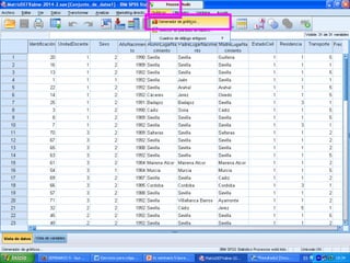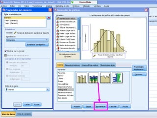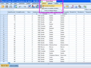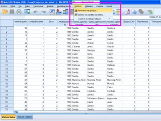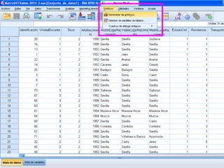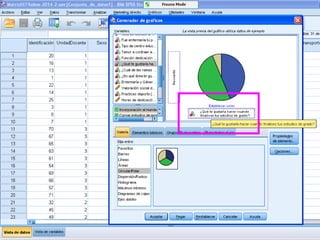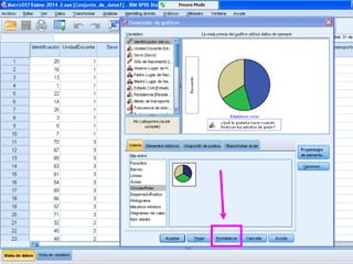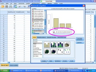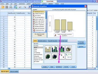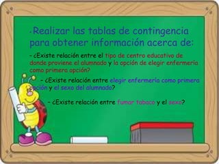 Este documento describe cómo realizar tablas de contingencia, tablas de frecuencia y representar gráficamente variables nominales, ordinales y de escala utilizando el programa SPSS. Se proporcionan ejemplos de cómo crear tablas de contingencia para analizar las relaciones entre variables y tablas de frecuencia para describir la distribución de variables. También se muestran ejemplos de diagramas como barras, sectores, histogramas y cajas para representar distintos tipos de variables.