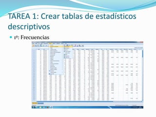 La tarea consistió en crear tablas y gráficos estadísticos descriptivos a partir de variables como edad, peso, talla y colesterol de pacientes. Se generaron tablas de frecuencias, estadísticos descriptivos, y gráficos como histogramas y cajas para explorar los datos. Luego se calculó el índice de masa corporal y se analizaron los resultados por sexo.