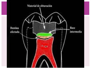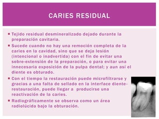 El documento describe la caries residual, que es el tejido dental desmineralizado que queda después de la preparación de la cavidad. Existen técnicas como el dressing y el step-wise que dejan intencionalmente caries residual para detener el avance de la lesión sin necesidad de eliminar todo el tejido infectado. La evidencia sugiere que las bacterias en la biopelícula son el problema principal y no necesariamente la dentina infectada.