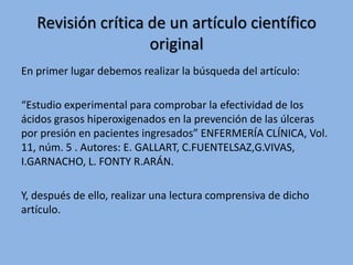 Este documento resume un artículo científico que investigó la efectividad de los ácidos grasos hiperoxigenados en la prevención de úlceras por presión en pacientes hospitalizados. El estudio incluyó una muestra de 192 pacientes divididos aleatoriamente en un grupo experimental que recibió ácidos grasos hiperoxigenados y un grupo de control. Los resultados mostraron que el 35% de los pacientes en el grupo de control desarrollaron úlceras por presión, en comparación con solo el 19% en el grupo experimental, lo que sugiere que