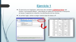Este documento resume tres ejercicios de análisis exploratorio de datos utilizando el paquete R. En el primer ejercicio, se describen dos variables cualitativas en tablas de frecuencias. En el segundo, se analizan dos variables numéricas usando resúmenes estadísticos. En el tercer ejercicio, se crean gráficos como diagramas de sectores, barras, histogramas y cajas para interpretar la distribución de variables.