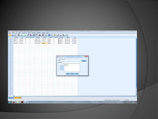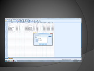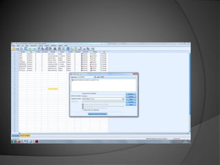 El documento describe una serie de ejercicios realizados en el programa SPSS. Se introducen variables y datos de encuestas de enfermeras andaluzas y estudiantes. Se definen las variables, se asignan etiquetas y valores, y se introducen y exportan datos entre SPSS y Excel. El objetivo es familiarizarse con las funciones básicas de SPSS para el análisis estadístico de datos.