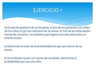 El documento presenta 4 ejercicios de probabilidad resueltos. El primero calcula la probabilidad de que un paciente pediátrico sea menor de 24 meses (26%) y que sea niña (46%). El segundo calcula la probabilidad de no padecer hipertensión ni hiperlipemia (65%). El tercero calcula la probabilidad de avería de autobuses (1.95%), siendo mayor para la línea 1. El cuarto calcula la probabilidad conjunta de que 2 tiradores den en el blanco (10%).