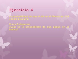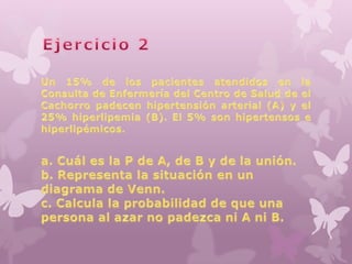 El documento presenta varias probabilidades sobre diferentes sucesos. Calcula la probabilidad total de que sean menores de 24 meses como la suma de la probabilidad condicional de cada caso. Luego aplica el Teorema de Bayes para calcular la probabilidad de ser niña dado que son menores de 24 meses. Finalmente, da valores de probabilidad para varias líneas de autobús y calcula la probabilidad de avería total y la probabilidad de cada línea dado que haya avería.