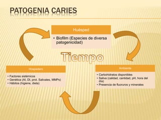 Este documento presenta información sobre cariología, incluyendo la patogenia de la caries dental, métodos de diagnóstico, grupos de riesgo, protocolo CAMBRA y terapéuticas. Explica factores protectores y de riesgo de la caries, así como métodos como inspección visual, táctil, radiográfico, fluorescencia láser y conductividad eléctrica para el diagnóstico. Define grupos de riesgo bajo, moderado, alto y extremo, con diferentes tratamientos basados en el protocolo CAMBRA.