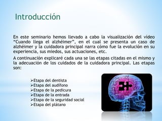 El documento describe las diferentes etapas por las que pasó una paciente con Alzheimer, incluyendo obsesiones con ir al dentista, reparar un audífono roto, y recibir pedicuras frecuentes. También describe cómo su hija cuidadora inicialmente trató de corregir los errores de su madre, pero luego cambió a interpretar la realidad desde la perspectiva de su madre para enfocarse en su felicidad. Al final, la hija colocó a su madre en un centro de cuidados donde recibió buen cuidado y pudo vivir en el presente sin