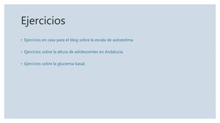 Este documento presenta varios ejercicios sobre tipificación de valores normales. Incluye ejercicios sobre la probabilidad de obtener una puntuación baja en una escala de autoestima, el porcentaje de adolescentes con diferentes niveles de estatura en Andalucía y la proporción de diabéticos con diferentes niveles de glucemia basal. Cada ejercicio calcula estas probabilidades y porcentajes usando la distribución normal y tablas de tipificación.