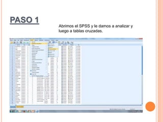 Este documento proporciona instrucciones en 5 pasos para realizar una prueba de chi cuadrado en SPSS. Explica cómo seleccionar variables, calcular estadísticos chi cuadrado, e interpretar los resultados para determinar si se acepta la hipótesis nula de independencia o la hipótesis alternativa de dependencia entre variables.