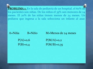 Este documento presenta cuatro problemas de probabilidad y estadística resueltos. El primer problema calcula la probabilidad de que un paciente en un hospital sea menor de 24 meses. El segundo representa gráficamente las probabilidades de dos condiciones médicas. El tercero calcula la probabilidad de averías en autobuses de diferentes líneas. El cuarto encuentra la probabilidad de acertar un blanco cuando dos personas disparan.
