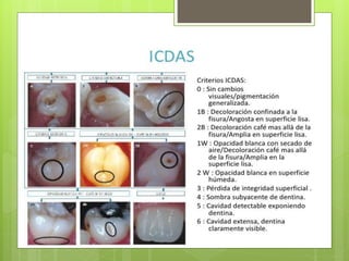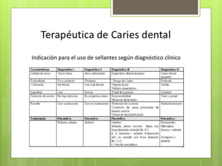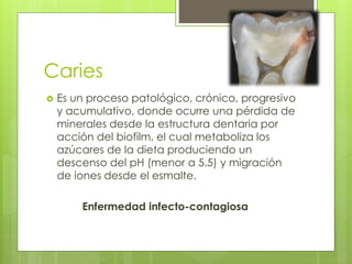 Este documento presenta información sobre cariología, incluyendo la patogenia de la caries, factores de riesgo y protectores, métodos de diagnóstico, grupos de riesgo, y terapéutica de la caries. Explica el proceso de desmineralización dental causado por bacterias y azúcares en la dieta, y cómo la saliva y el flúor ayudan a prevenir la caries. También describe protocolos para evaluar y tratar a pacientes según su riesgo de desarrollar caries.