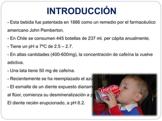 El documento describe un caso clínico de un paciente de 40 años que consume Coca Cola diariamente y ha desarrollado manchas en los dientes. El consumo excesivo de Coca Cola, con su bajo pH, es la causa probable de las lesiones cervicales no cariosas. El tratamiento incluirá educación sobre el consumo de Coca Cola, pulido dental, restauraciones de resina compuesta y fluoración para prevenir futuras caries.