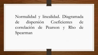 Este documento resume un ejercicio para determinar la relación entre las variables altura y peso. Se utilizan gráficas de dispersión, histogramas, pruebas de normalidad y coeficientes de correlación. Los resultados muestran que altura y peso no siguen una distribución normal, tienen una relación lineal positiva débil y una correlación positiva muy débil.