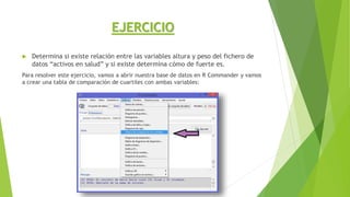 Este documento resume un análisis bivariado de las variables cuantitativas altura y peso utilizando datos de una base de datos de salud. Se determinó que altura y peso no siguen una distribución normal a través de histogramas, gráficos Q-Q y boxplots. Un diagrama de dispersión y pruebas de correlación de Pearson y Spearman mostraron una correlación positiva moderada del 63% entre altura y peso, indicando una relación entre las variables.